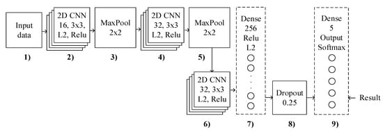 These basic operations (layers) form the core of almost every convolutional neural network. The task of the first layers is to extract the necessary samples from the input data. These first three layers are usually repeated several times. As you can see in Table 4, the layer consists of several functional maps. The main task of the functional map is the extraction of selected features using a convolution filter. The samples are then combined into feature map within the fully interconnected layers and perform a final operation called classification [23,24,25]. This modified CNN divides into nine main blocks (see Figure 17):