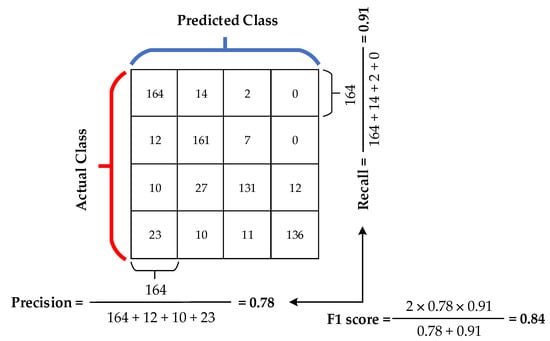 The parameters (P, R, F1) were calculated from the obtained values (see Table 6). The precision is the ratio between True Positive (TP) and the sum of positive data (True Positive (TP) + False Positive (FP)). The recall is the ratio between True Positive (TP) and the sum of data from the actual class (True Positive (TP) + False Negative (FN)) as shown in Figure 18. The F1 score is a combination of precision and recall (weighted average value of precision and recall). The TP value indicates the number of correctly classified patterns of the class true, the value FP indicates the number of incorrectly classified patterns of the class true. The value TN indicates the number of incorrectly classified patterns of class false, and the value FN represents the number of incorrectly classified patterns of class false.
