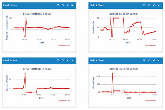 A serial communication protocol with a baud rate of 115,200 is set and the device is connected to the Internet with a pre-set Wi-Fi Service Set Identifier (SSID) and password. Rather than implementing a classical PC-based user interface, our aim is to let the user access the data everywhere and, at the same time, increase the portability of the complete system. With a ThingSpeak private account and an Application Programming Interface (API) address, a Transmission Control Protocol connection is then established between the ESP8266EX and ThingSpeak cloud and the data can be monitored on the ThingSpeak API website, as shown in Figure 4. The sensor data shown are prior to calibration.