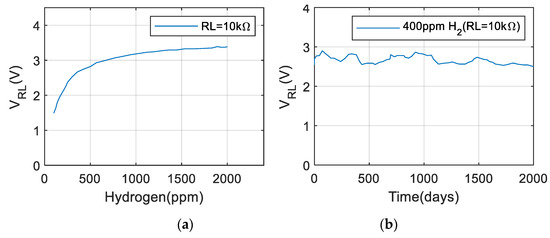 We used the MQ-8 sensor to extract the points on the graph ( = for H2. A set of points was extracted using WebPlotDigitizer to get a mathematical model that matches the data. Figure 6a shows the sensitivity curve, which shows the VRL in hydrogen with different concentrations and that the resistance load RL is 10 kΩ, and Figure 6b shows the long-term stability curve. The response graphs of the sensor provided by the manufacturer are plotted under standard conditions [16]. It provides the baseline of the characterizations for different practical applications, in this case, nuclear waste storage.