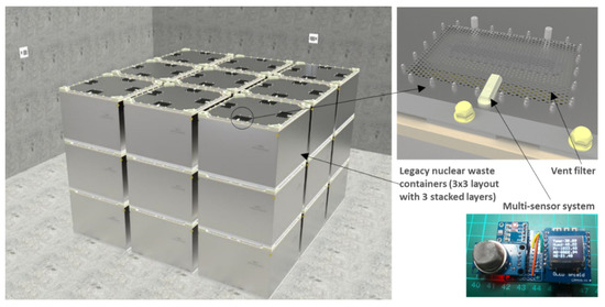 The system is designed to perform under harsh environmental conditions and, in particular, the system is supposed to be deployed within the nuclear site. The sensors have been designed to be attached to legacy nuclear waste containers, which have an inner temperature between ~22 and 55 °C at normal room temperature. Additionally, the containers have a relatively low external contact radiation dose rate that does not cause any signal or data transmission interference [21]. However, the system at this stage has not been designed to be exposed to radiation, as it is in the conceptual design phase. Therefore, no shielding is required, and neither is a communication protocol with loss detection and re-transmission. A 3D model rendering image is shown in Figure 7, which depicts the stacking up of the legacy nuclear waste containers within the storage facilities. The containers have four filters on the lid to vent hydrogen gas to the ambient. The sensors can be fixed in the vicinity of the filters. Therefore, to replicate the scenario in a laboratory-based experiment, a small stainless steel cubic box was used for the validation of the multidetector sensor’s performance within the metal’s proximity.