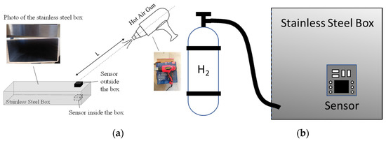 In scenario 1, the temperature change is undertaken with a hot air flow passing through the surface of the sensor. Two conditions are tested individually: outside and inside the stainless steel box, and on the cap of the stainless steel bottle. The hot air flow is induced by a DEWORX Original 2000 W Hot Air Gun, which has two heating levels (600 °C and 300 °C) and two flow rate levels (300 L/min and 500 L/min). For both the inside and outside testing, the hot air gun is set to a fixed flow rate and held at a fixed distance above the sensor with the hot air flow directly pointing to the sensor. This can be seen in Figure 8a.