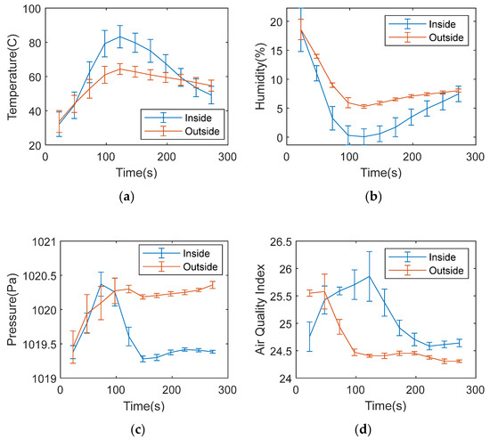 Scenario 1 test results for both inside and outside the stainless steel box: (a) Temperature; (b) Humidity; (c) Pressure; and (d) Air quality index.
