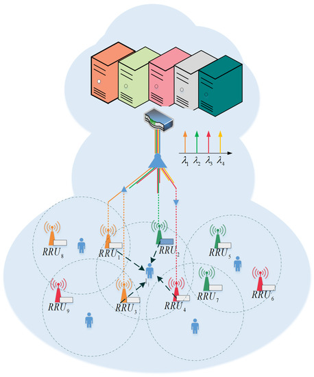 However, the prior works are carried out under ideal fronthaul or backhaul links. Motivated by this, Ha et al. proposed two low-complexity algorithms, in which the cooperative set, precoding, and power allocation scheme are jointly designed under fronthaul constraint [22]. Similarly, multicast technology was introduced into wireless backhaul, combining multicast beamforming and RRU clustering for sum-rate maximization [23]. However, the researches mentioned above have considered resource scheduling in a fixed fronthaul link. In this paper, we adopt TWDM-PON as fronthaul network. To flexibly adapt to load requirements, the wavelengths allocated to each RRU can be adjusted dynamically.