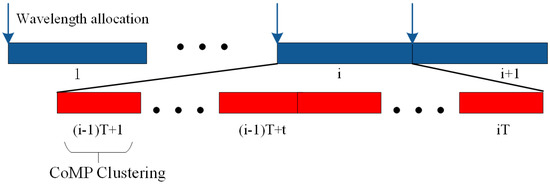 As the wavelength resource and wireless resource allocation occur in different timescales, we establish a two-timescale resource allocation framework [31]. As shown in Figure 2, the system time is divided into multiple time frames, marked as i, then each RRU is assigned a wavelength based on the long-term utility at the beginning of each time frame. Each time frame contains T time slots in which a cooperative set is formed for the user according to the current network conditions, and then spectrum resources are allocated.