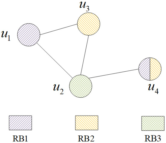 Note that the increase in RRU load leads to increasing interference among conflicting users who are allocated the same RB. To address this issue, we optimize the RB allocation when the coalition structure is changed. Since the cooperative set is overlapped, the traditional resource allocation algorithms for FDMA cannot be directly applied to this scenario. Then we adopted a list coloring algorithm to allocate RB for each cooperative set [32]. In the proposed algorithm, the interference of overlapping cooperation cluster can be modeled using a graph , as illustrated in Figure 3.