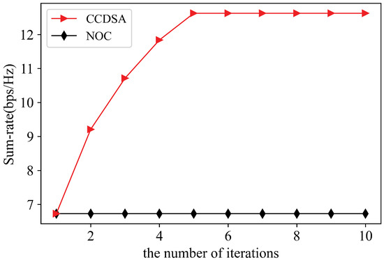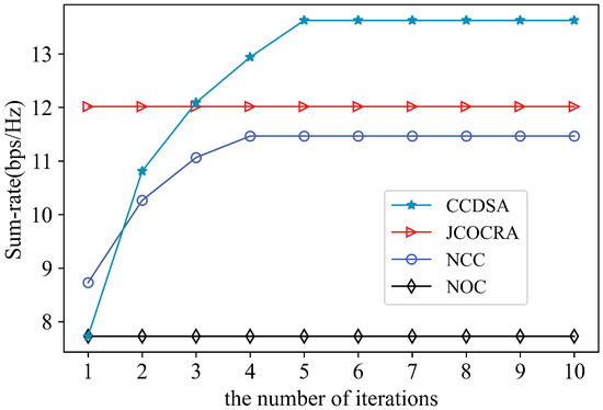 Figure 5 shows theperformance comparison of different algorithms. In the initial iteration of the algorithm, the sum-rate of the NCC and JCOCRA algorithms is higher. Because the proposed algorithm uses the cache-aware association decision at the beginning, which cannot ensure the best channel quality. However, as the number of iterations increases, the proposed algorithm can further increase the user’s rate through coalition structure update under the limitation of fronthaul capacity.