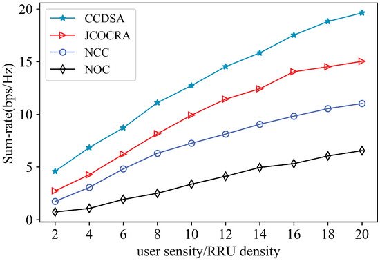 Figure 6 illustrates the sum-rate performance of CCDSA algorithm over other algorithms with different network loads. Observe that, when user density is low, the gap among four algorithms is small since the spectrum resource and fronthaul bandwidth is sufficient for user services. As the user density increases, the sum-rate improves. However, the performance improvement of NCC is limited since the network-centric clustering cannot avoid inter-cluster interference. In all cases, CCDSA algorithm always performs the best; meanwhile, when user density is high, CCDSA algorithm can achieve greater performance gains under the limitation of fronthaul capacity and spectrum resources.