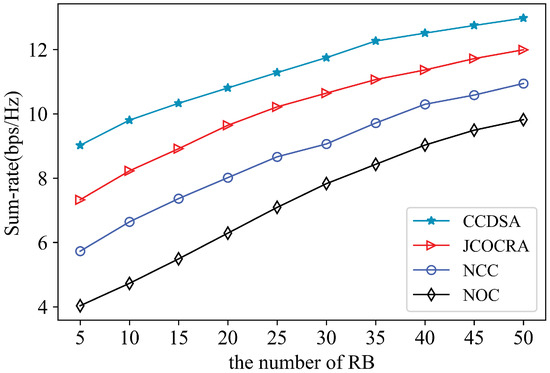 The performance is further investigated here as a function of the number of RBs in the network. It is clearly observed in Figure 7 that the sum-rate is increased with the number of RBs. This implies that more RBs lead to having more cooperating RRUs ready to serve more users. If the number of RBs is sufficiently high for all users, the gap among different schemes is small; otherwise, our scheme shows better performances, because our scheme can balance the load among RRUs and make full use of RBs through the joint design of the user’s cooperation set selection and resource allocation.