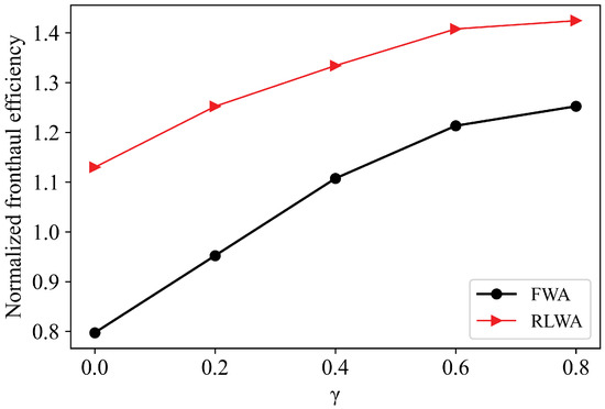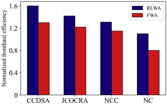 In Figure 9, we compare the fronthaul efficiency of different schemes. Compared FWA, RLWA algorithm performs better over each clustering scheme. Because the intelligent agent learns the network environment in a long time scale and adjusts the wavelength selection of each RRU according to the best clustering scheme so as to improve the long-term effectiveness of the system. On the other hand, the clustering scheme in a short time scale will also greatly impact system performance. It can be seen from Equation (1), since the fronthaul load is fixed given wavelength allocation, the improvement of user rate caused by clustering strategy in each time slot can further raise the system fronthaul efficiency gain.