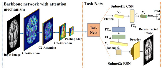 The proposed WSL-based DL framework, which is called ADGNET, is a CNN-based single-input-multi-output (SIMO) architecture consisting of two components: an improved backbone network with the attention mechanism and task nets that consists of two sub-networks, i.e., the classification sub-network (CSN) and the reconstruction sub-network (RSN). The backbone network has a residual network structure with the proposed AM to obtain highly discriminative representations while suppressing unrelated regions in the images. As shown in Figure 1, the backbone network consists of five convolution stages (C1-Attention to C5-Attention), followed by the Resnet. Generally, feature maps generated by the deeper stages contain more semantic information, and those generated by the shallower stages contain more detailed information, such as edges and corners. The backbone network extracts features step-by-step from the MRI input images and generates a pooling map using global average pooling (GAP). The task nets use the pooling map as input and flatten it as a feature vector . The is then sent to two different task branches; one generates the prediction vector using the FC layer, and the other reconstructs the original images using the FC layers and a decoding module. As shown in Figure 1, the is sent to the argmax (Amax), which returns the index with the largest value of the axes of the and provides the classification results. Here C denotes the number of categories.