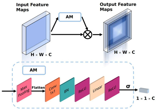 The AM is an automatic weighting module that learns the channel weights of the input feature maps. As shown in Figure 2, the input is first downsampled using the global max-pooling operation to retain important information while reducing the computational cost. The downsampled feature maps are then flattened into a one-dimensional vector. The flattened vector is then sent to a convolution layer with a kernel to extract features from the vector and adjust its dimension. The extracted features are sent to the batch norm (BN) layer and activated using the ReLU function to speed up the training and convergence speed of the module and increase its nonlinear representation ability. After these operations, an FC layer (Linear) with ReLU as the activation function is adopted to output the CAF with a size of . The final output is generated using the sigmoid function to convert the values of the CAF to a range of 0 to 1; these values can be considered the importance scores of the channels in the .