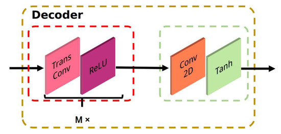Details of the proposed decoder component. The decoder consists of two parts, including a transposed convolution layer with a ReLU activation function and a convolution with a convolution layer and a Tanh layer.