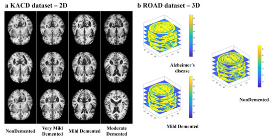 Examples of multi-modal data; (a) magnetic resonance imaging (MRI) images (2D) from the KACD dataset, (b) MRI images (3D) from the ROAD dataset.