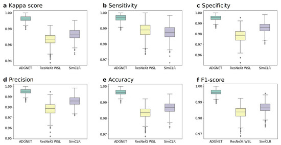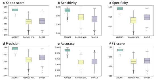 In this experiment, we used the 2D MRI images from the KACD dataset to evaluate the models’ performances. The overall results of the six metrics for the proposed ADGNET, the ResNeXt WSL, and the SimCLR are listed in Table 2. The optimum performance was obtained by ADGNET, with an F1-score of 99.61%, followed by SimCLR (98.67%) and ResNeXt WSL (98.37%). The Acc was highest for ADGNET (99.61%), followed by SimCLR (98.60%) and ResNeXt WSL (98.36%). The Pr, Spe, Sen and Kappa of ADGNET were 99.53%, 99.53%, 99.69% and 99.22%, respectively. The values of the indices were higher than those of ResNeXt WSL (97.84%, 97.81%, 98.91% and 96.72%) and SimCLR (98.60%, 98.59%, 98.75% and 97.34%). The corresponding boxplots of the six evaluation metrics (Kappa, Sen, Spe, Pr, Acc and F1-score) of the models’ performance on the KACD dataset are shown in Figure 5.