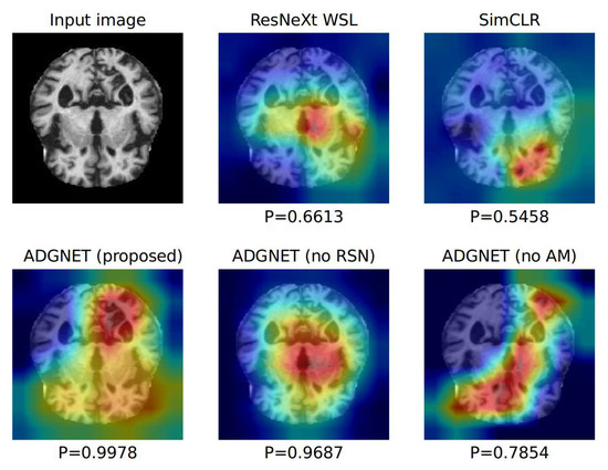 We developed a CAD method for the identification and classification of AD in multi-modal brain imaging data (2D MRI and 3D MRI) using WSL-based DL techniques. Excellent performance was obtained by the proposed ADGNET based on six evaluation metrics, and the method proved superior to two SOTA WSL-based methods. The proposed ADGNET is a modular framework consisting of a backbone and the task subnets. We used a residual block in the design of the backbone network to retain the features while preventing degradation of the framework. We incorporated an AM into the backbone network to ensure the high discriminatory ability of the backbone network with a low computational cost. Unlike the conventional methods like Resnext WSL which assign the same weight to each channel, the proposed AM learned the channel weights of the input feature maps from the supervised information and the images for an improved feature representation of the samples. This helps the framework to focus more on the most discriminative part from the feature space. The feature vector obtained from the pooling map of the backbone network was flattened and sent to the two sub-networks. The CSN extracted the feature information directly from the vector and was optimized using the supervised information. The RSN encoded the vector to a new feature space using two FC layers and used a decoder to reconstruct the input images. The two FC layers and the backbone network comprised the encoder that was used for feature coding. The proposed decoder network consisted of the transposed convolution layer and the convolution layer. The objective of the transposed convolution layer was to learn the feature information for image reconstruction, and the convolution layer was used to adjust the number of channels and generate the final output. Unlike previous WSL-based methods (e.g., ResNeXt WSL and SimCLR), which have to be pre-trained on a large independent dataset and fine-tuned on the target dataset, the proposed ADGNET is trained in an end-to-end manner. The training process of the ADGNET is controlled by adjusting the weighting parameters. When is zero, the network only learns the features from the images. When is zero, the network only learns the features from the annotations. In this way, the large-scale unlabeled data can be fully utilized to help the proposed framework obtain more stable and representative features. Excellent performance was achieved by ADGNET based on the six statistical metrics for the multi-modal brain imaging datasets (KACD (2D MRI) and ROAD (3D MRI)). In order to intuitively analyze the experimental results, the heatmaps of the proposed ADGNET and the two SOTA models were demonstrated in Figure 7. As can be seen from Figure 7, the proposed ADGNET is able to capture key features while retaining more features by means of the AM and the RSN. While the ResNeXt WSL and SimCLR only use very limited features for prediction and their prediction scores are relatively low. Notably, the ADGNET’s prediction score is quite higher than ResNeXt WSL and SimCLR, which indicated that the ADGNET’s prediction is more reliable. The ADGNET has a promising potential as an auxiliary tool to assist in the diagnosis of AD due to its high performance, good stability, and cross-modal flexibility. Besides, medical diagnosis in a real situation is much more complex than in experimental environments, and sufficient and high-quality annotations are difficult to obtain. Therefore, the development of our proposed WSL-based DL methods is crucial for diagnosing conditions such as AD. However, the proposed ADGNET may also encounter some problems when the distribution of the data has extremely category imbalance. It is also important to develop effective generative frameworks to generate a large amount of effective data for compensation with WSL-based methods.