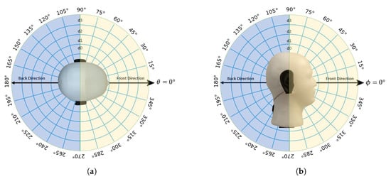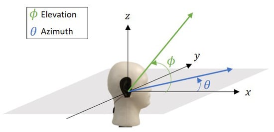 Human binaural hearing is able to approximate the location of a sound source in a spherical or 3D coordinate (i.e., azimuth and elevation planes). This is achieved by the shape and position of the ears on the head, and the auditory cues interpreted by the brain. As illustrated in Figure 1, the azimuth angle is represented by , while the elevation angle is represented by . Moving the sound source from left to right would change and moving it up and down will change , and each varies from ° to °.