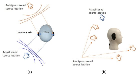 - Risoud, M.; Jean Noel, H.; Gauvrit, F.; Renard, C.; Bonne, N.X.; Vincent, C. Azimuthal sound source localization of various sound stimuli under different conditions. Eur. Ann. Otorhinolaryngol. Head Neck Dis. 2019, 137, 21–29. [Google Scholar] [CrossRef] [PubMed]