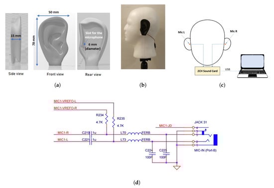 (a) Illustrations on the ear model from the STL file; (b) Left view of the HATS with the 3D printed ear; (c) Sketch of the setup with microphones on the left and right ears (i.e., Mic L and Mic R). (d) Detailed connections between the microphones and the computer.