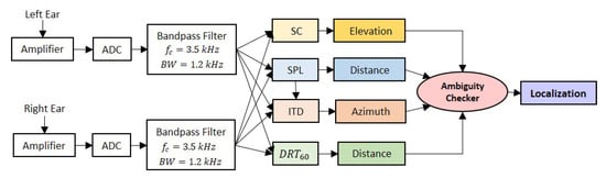 The following block is the analysis of the auditory cues split into four categories, spectral cues (SC), and (explained further in Section 3.2), SPL and ITD. Fast Fourier Transform (FFT) is performed on the filtered signal in order to find the spectral components in the frequency domain of the audio source used in SC. , SPL, and ITD, on the other hand, are measured in time domain. The ITD and SC are essential for azimuth angle and elevation angle estimations respectively. In order to estimate the Euclidean distance between the center of the DUT and the sound source, both and SPL will be used. Ambiguous data points are then filtered before the sound source is localized.