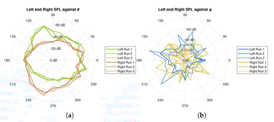 Sound pressure level (SPL) measured from the three trials for right and left ears on (a) azimuth plane; and, (b) elevation plane.
