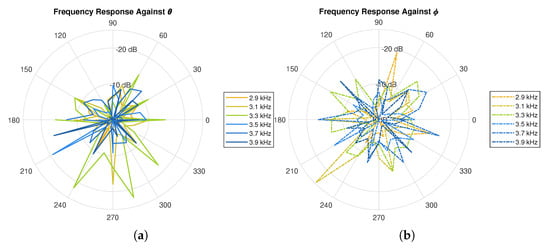 By measuring and from the incoming signals’ spectral components, the angle can then be calculated by solving the inverse function of Equation (14), which reduces to