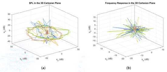 Illustrations of SPL (a) and frequency response (b) in the 3D Cartesian plane relative to the DUT (represented by the head icon).