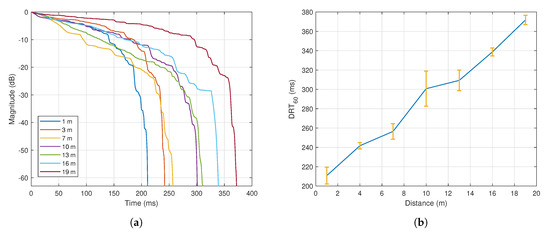 In this work, a car honk was used as the targeted sound source as it creates distinctive acoustic characteristics that are suitable for outdoor spaces. The impulse to noise ratio (INR) for this sound is above 44.2 dB, which is sufficient according to the ISO 3382-2 for accurate RT measurement in outdoor spaces within 50 m range [45]. Its unique identity was represented by its frequency components, where the range varied from 2.9 kHz to 4.0 kHz with peaks at every 200 Hz interval. In this analysis where the setup was done outdoors, the sound source was initially placed at the front of the DUT on the azimuth plane (i.e., ), and data was captured when it was located at varying distances ranging from 1 m to 19 m. Figure 11a shows the time response of the measured sound amplitude after the source was abruptly switched off at different distances. In order to calculate the , which refers to the time for the combined direct and reverberant energy level to decay by 60 dB, the perceived signal was firstly band-passed to the desired frequency range of 2–4 kHz. Considering as the energy decay curve from time t where is the impulse response from the band-passed signal, a linear regression was performed in order to estimate the slope, S, between the −5 dB and −25 dB level range (similar to RT estimation via T20 method: https://www.acoustics-engineering.com/files/TN007.pdf). The can then be estimated as . The corresponding against distance is depicted in Figure 11b which shows the average of five trials along with the error bars.