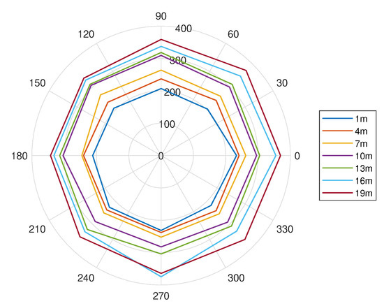 In order to analyze the variation of further, the same test was conducted with varied from until at a step of °. Figure 12 shows the against the azimuth angle. The measured however did not reveal any distinctive trend and it only has small deviations at different angles.