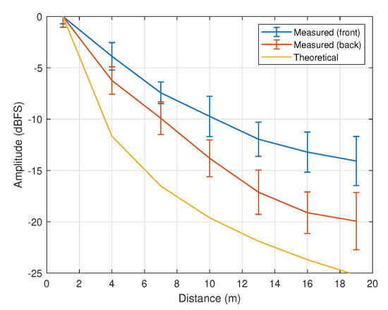 Apart from the test, another test to investigate the variation of SPL was also conducted. Figure 13 shows the variations of the average SPL from both ears against distance when the sound source was located at the front (blue line) and back (orange line) positions. The average amplitude and error bars are represented by the curve and vertical lines, respectively. Theoretically, the sound intensity changes with distance following the inverse square law, as represented by the yellow line in the figure.