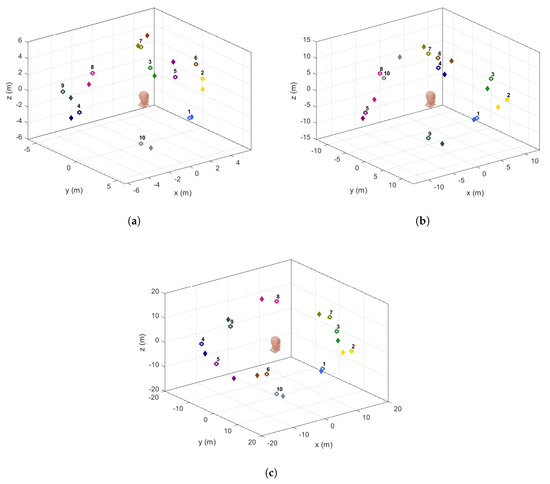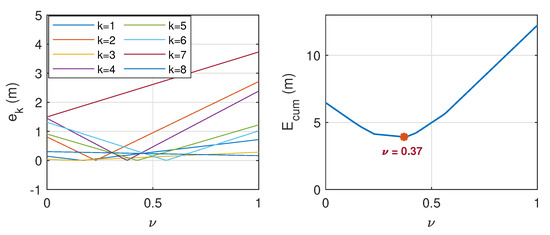 with representing the weighting parameter that varies between 0 and 1. To find the optimal value of , a further analysis was conducted based on 16 datasets, as presented in Table A1 (in Appendix A), where half of them refer to the case when , while the other half refer to the case when . In this analysis, the distance between the DUT and source varied between 6 m and 19 m. The cumulative distance error, which reads: