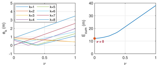 Distance error, (left) and cumulative distance error, , (right) when . is minimum when .
