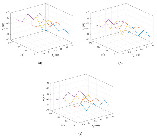 The clues to sound location that come from sound frequency are called spectral cues. These spectral cues derive from the acoustical filtering of an individual’s auditory periphery. Since the angle and distance on the azimuth plane can be calculated using ITD, SPL and , but not for the elevation plane , the spectral cues are vital in determining the elevation of the sound source. The ambiguous data points in the cone of confusion can be reduced using mathematical estimation. This work addresses the cone of confusion by characterizing the attenuation of different frequency elements against . Figure 16 depicts the amplitude () at each peak frequency, , when the sound source was placed at (blue line), (orange line), (yellow line), and (purple line). The data were also captured at three different distances; m (a), m (b), and m (c).