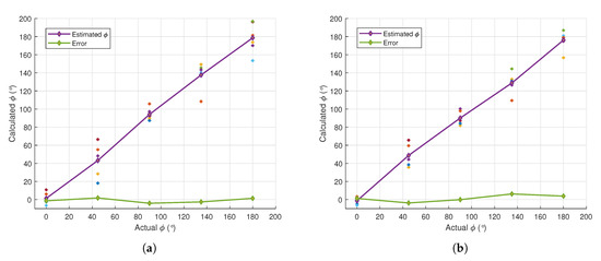 In order to obtain the estimated when the sound source is placed at a particular location, the calculated angle is averaged over all peak frequencies. Figure 17 shows the results from a simple test when the source was placed at . The left plot is the case when the source was 6 m away from the DUT, while the right plot is the case when the source was 13 m away from the DUT. From the test, it was found that the magnitude of the error only varied between and , which can be considered to be small, as the average error is less than 3.5%. Thus, the close relationship between the SC cues and the elevation angle will allow for the vertical direction of the source to be robustly localized.