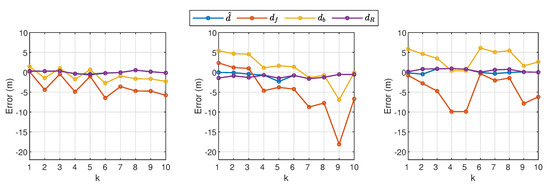 with d being the actual distance is considered. Figure 14 and Figure 15 show the corresponding plots when and when , respectively. By observing the value of when is minimum, it is found that the distance error can be minimized when when , and when . The latter indicates that the estimated distance that is based on the is generally much closer to the actual value when the sound source is located at the back of the DUT, thus only is considered in this scenario.