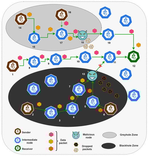 In a blackhole attack, all the receiving packets are dropped by the adversary node [9]. As illustrated in Figure 1, node 1, 2, and 6 relayed packets to node 12. The intermediate node 13 (a blackhole node) falsifies to be the nearest node to the destination (i.e., 12), generating a blackhole zone, for example. The nodes 2 and 6 route their packets via this node (node 13). The node 2 and 6 mistakenly choose the node 13 to be the optimal choice but, being malicious, node 13 will capture and drop all the packets received from 2 and 6. This degrades the performance and causes extensive power drainage due to re-sending of lost packet [9]. On the other hand, node 1 does not select this route, and all its packets are delivered to the destined node 12. Similarly, in a greyhole attack, only a few data packets are forwarded (from node 14 and 16 to node 12), and the rest are dropped cleverly to avoid detection [9] (as illustrated in the greyhole zone in Figure 1). The blackhole attack is easy to detect. It drops all the messages, whereas selective forwarding attacks are challenging, such as greyhole attacks. They circumvent detection covertly and intelligently by taking periodic packet loss, particular packet loss, and intermittent packet loss into account [49]. These kinds of attacks are a serious threat in large SN deployments, such as in IoT frameworks, where the sink node is far from the SN.