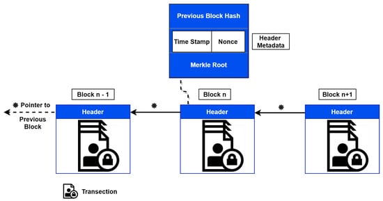 The blockchain is a (kind of) data structure with a chain of blocks where the connection between blocks is an address pointer based on a hash value [52]. All nodes independently hold their copy of the blockchain; the current “state” of the chain is calculated by processing each transaction to appear in the blockchain. Each block consists of six parts, as shown in Figure 2. It has a hash of the previous block, nonce (“number used once”), the hash of the current block, the Merkle root (hash of multiple transactions), a timestamp, and the transaction data [53]. Depending on the application, the block components may vary. The block headers contain metadata that helps block validation and links the previous blocks in the public ledger.