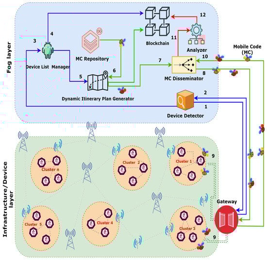 Hence, we demonstrate the benefits of blockchain in the context of internal attacks that IoT devices/sensors are subject to. We build-upon our previous work [9] to examine how to weave blockchain into a mobile-code, multi-edge system. In Reference [9], we proposed a software-defined-network-based Mobile Code-driven Trust Mechanism (MCTM), which was an energy-efficient solution for addressing internal attacks. Primarily, blockchain provides a distributed yet scalable trust information management, where the calculated trust values are recorded on the corresponding fog nodes. The mechanism proposed in this paper supports the distributed and scalable nature of IoT by following the temper-proof, decentralized, and immutable features of the blockchain. In addition, it also generates dynamic itineraries whenever a node joins or leaves the network to meet the dynamic nature of WSNs. The main contributions of this research are as follows: