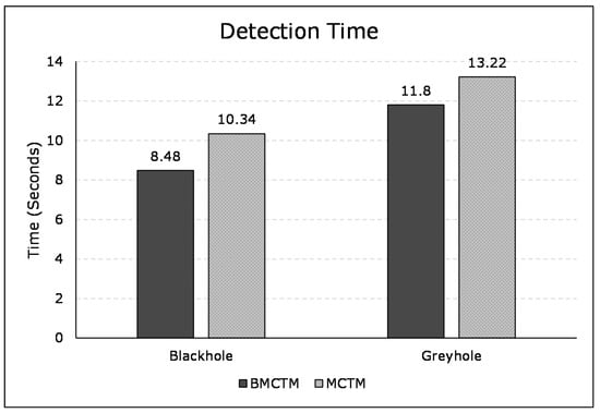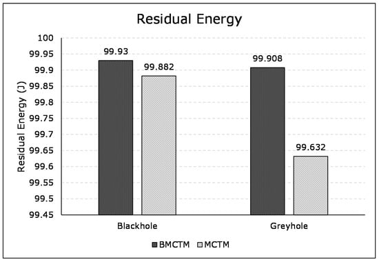 An SN is considered dead if its energy drains fully. Simultaneously, a network’s lifetime depends on the first node’s collapse upon its complete depletion of energy. Figure 9 demonstrates the average residual energy of the network in both the greyhole and blackhole attack scenarios. It shows that, while detecting and isolating of blackhole attack, the average residual energy of BMCTM is 99.93 J, while it is 99.882 J for MCTM. This shows 0.048% more residual energy in BMCTM than in MCTM. Similarly, the residual energy of BMCTM is 99.908J and that of the MCTM scheme is 99.632J, with a difference of 0.045% in the greyhole attack scenario. We followed the same initial energy parameters and energy consumption model in both scenarios for the two schemes to remain in line with the same environment as was proposed in Reference [9], as shown in Table 4. The BMCTM established better results due to relatively less message overhead, multi-mobile codes, and no trust-related computations at the node level.