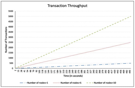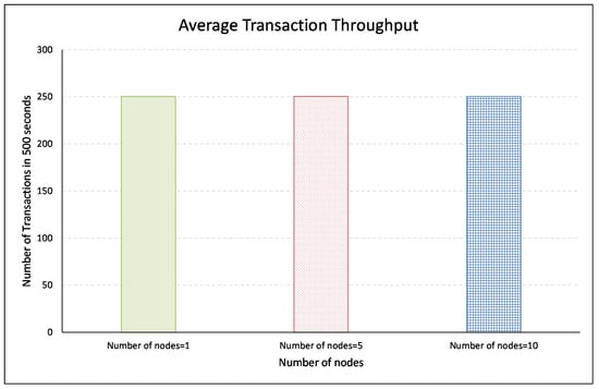 The throughput (in our case) is referred to as the degree of transactions recording in the blockchain in a scalable and efficient way. A mechanism is “scalable” if it does not deteriorate with an increasing number of connected nodes and works invariably. To validate the proposed mechanism’s scalability, we ran the mechanism for 1, 5, and 10 nodes and compared the throughput. Figure 10 illustrates that one node transacted 500 transactions into the blockchain in 500 s, 5 nodes made 2500, and 10 nodes made 5000 transactions. It may be noted that for an increased number of transactions, the proposed mechanism took the same time (i.e., 1 s). It is further elaborated in Figure 11, which represents an average transaction throughput of BMCTM. It shows an average number of transactions made in 500 s for 1, 5, and 10 nodes. On average, one node made 250 transactions. Similarly, on average, 5 and 10 nodes also made the same number of transactions in the same amount of time, which shows that the proposed mechanism remained persistent. It did not deteriorate with an increasing number of nodes and took the same time as was taken by one node only.