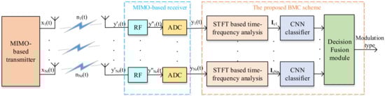 This paper is organized as follows. The signal models of the MIMO and SISO systems and the STFT-based time–frequency analysis method are introduced in Section 2. Section 3 presents the BMC scheme for the MIMO systems, including the proposed CNN model and the decision method. Then, the RGB spectrogram image and the classification performance in different scenarios are analyzed in Section 4. Finally, conclusions are drawn in Section 5.