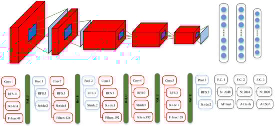 Architecture of AlexNet (Conv: convolution layer, Pool: pooling layer, F.C.: fully connected layer, RFS: receptive field size, N: number of neurons in fully connected layer, AF: activation function, Soft: softmax) [].