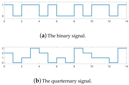 In this subsection, in order to simplify the analysis, we select only certain binary and quaternary digital signal sequences (as shown in Figure 4) to generate the RGB spectrogram image. The binary signal Figure 4a is used to generate the two-order modulated signals (i.e., 2ASK, 2FSK, and 2PSK), and the quaternary signal Figure 4b is used for the four-order modulated signals (i.e., 4ASK, 4FSK, and 4PSK).