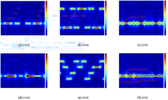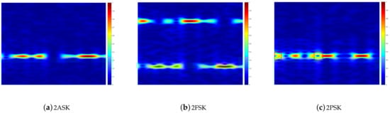 The RGB spectrogram images of the PSK-modulated signals are shown in Figure 5c,f. The phase mutation of the modulated signals is captured in the RGB spectrogram images. Specifically, Figure 4a and Figure 5c both have the -phase mutation in the 2PSK-modulated signal from 0 to 1 and from 1 to 0 in the binary digital signal sequences. The -phase mutation decreases the value of the power spectral density at the modulated frequency, which appears as a “ring” in the RGB spectrogram image. Similarly, comparing Figure 4b and Figure 5f, the - and -phase mutations also partly decrease the value of the power spectral density at the modulated frequency, but they appear as a “half-ring” in the RGB spectrogram image. Therefore, modulated signals with different modulation orders have different time–frequency features, and it is reasonable to classify the modulated signals using the time–frequency analysis.
