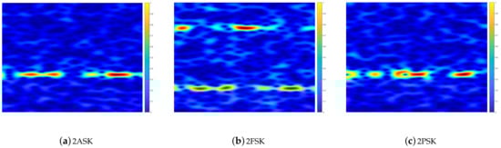 We now analyze how the MIMO channel influences the RGB spectrogram image of the modulated signals. The 2ASK, 2FSK, and 2PSK modulation schemes are discussed herein. The antenna configuration for the MIMO system is and ; then, the random channel attenuation assigns a value from , random phase shifts within one symbol interval are considered for the MIMO scenario, and the AWGNs with 10 dB SNRs are added into the modulated signals. In addition, a multiplexing-based transmission scheme is adopted for the MIMO system. Specifically, two transmitting antennas send two independent data streams, but with the same modulation scheme (e.g., 2ASK, 2FSK, or 2PSK). The result is shown in Figure 6.