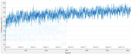 The motivation for transfer learning comes from the fact that people can intelligently apply knowledge learned previously to solve new problems faster or with better solutions []. In order to utilize the pretrained AlexNet, transfer learning is employed to fine-tune AlexNet and accelerate the training process. The last layer of the pretrained AlexNet network in Figure 3 is configured with 1000 classes, and this layer must be fine-tuned to accommodate the new classification task. First, all layers except the last layer are extracted; then, the last layer is replaced with a new fully connected layer that contains eight neurons (i.e., the number of modulation categories in this paper). In the end, the parameters of the activation layer and the classification output layer are set to accommodate the new classification task. Therefore, with such fine-tuning, the output of AlexNet can precisely perform the modulation classification of the received signals. The training hyperparameters are listed in Table 2; concretely, the minimum of the batch size is set to 10, the maximum of the training epoch is set to 10, and the learning rate is set to , respectively.