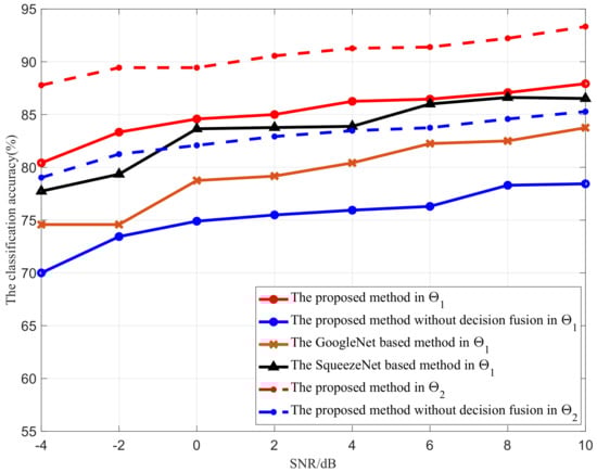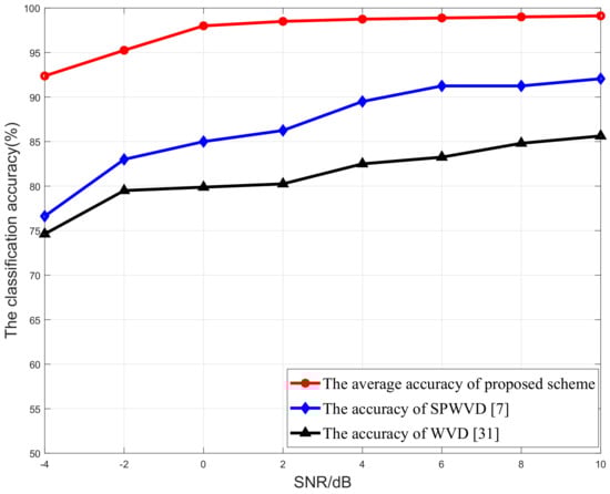 In order to better understand how different time–frequency analysis tools affect the performance of the proposed scheme, herein, both the smooth pseudo Wigner–Ville distribution (SPWVD)-based scheme [] and the Wigner–Ville distribution (WVD)-based scheme [] are introduced and compared with our proposed method for the SISO network, and the result is shown in Figure 13. In the simulation, the average classification accuracy of the proposed scheme is evaluated by varying the SNR of the signals from –4 to 10 dB. From this figure, we observe that as the SNRs of the signal increase, the classification accuracies of all three classification schemes are gradually improved. Moreover, our proposed scheme always has the highest average classification accuracy. Its classification accuracy is always larger than 92.37% even at SNR = dB, and it has a classification accuracy of 99.12% at SNR = 10 dB. This significantly outperforms the SPWVD-based method and the WVD-based method. These results confirmed that our method has higher classification accuracy and better robustness, even in the low-SNR region. In addition, by comparing with Figure 8, we note that the average classification accuracy of the MIMO scenario is lower than that of the SISO scenario. This is due to the fact that, by using multiple antennas at the transmitter, the signals from different transmitter antennas may non-coherently combine at each receiver antenna, thus worsening the classification performance, as mentioned in Section 4.1.