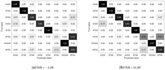 More specifically, the confusion matrices of the classification results are shown in Figure 10a,b for modulated SNRs of −4 and 10 dB, respectively. The MFSK- and QAM-modulated signals have the highest classification accuracies at both −4 and 10 dB, and the MASK-modulated signals have the second highest. The MPSK signals (especially the 4PSK signals) exhibit the worst classification performance, as shown in Figure 10a. Most of the 4PSKs are misclassified as 8PSK at SNR = dB, and the performance is improved only slightly at SNR = 10 dB. This result indicates that the MIMO system structure has negative effects on the time–frequency characteristics of the MPSK signals, which is consistent with the theoretical analysis. Hence, our proposed scheme has difficulty identifying the high-order PSK signals in the MIMO system. However, the time–frequency analysis and deep-learning-based scheme have excellent performance in classifying the MFSK-, ASK-, and QAM-modulated signals, and they can obtain superior average classification accuracy for the MIMO system.