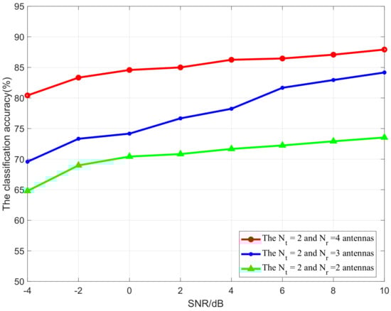 In order to completely characterize the performance of the proposed method, we further investigate how the antenna configuration impacts the obtained performance, i.e., 2 × 2, 2 × 3, and 2 × 4 antennas over the transceiver, and the result is shown in Figure 11. One can note that, on the one hand, the classification accuracy of the proposed scheme increases as the SNR of the modulated signals increases for all different antenna configurations. On the other hand, with the increase of the number of receiving antennas, the classification accuracy is increased. These results are as expected, since the increase of the number of receiving antennas at the receiver will improve the diversity performance of the MIMO-based system; then, the decision fusion algorithm can obtain the co-operation gained by jointly deciding the correct modulation with greater probability, and thereby improving the probability of identification. However, it is important to note that, herein, for our proposed scheme, we can obtain the diversity gain for the multiple antennas receiving at the receiver and also the co-operation gain for the decision fusion scheme. Since we do not perform the estimation of the channel, it is not possible to further obtain a coherent combination gain with the multiple antennas at the receiver.