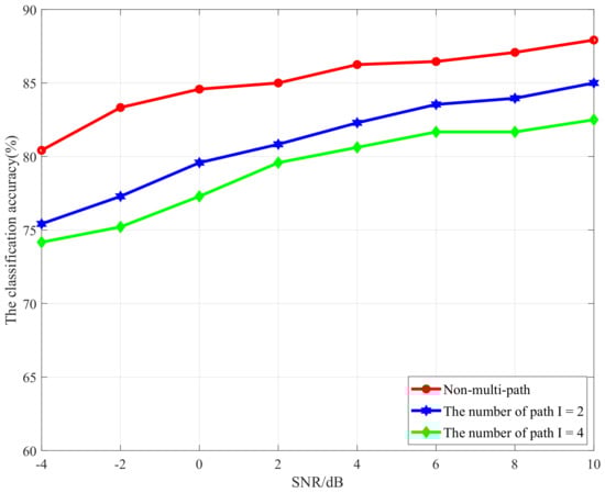 where I denotes the number of paths for each antenna, and denotes the received signal at the j-th antenna with the channel gain and delay []. In this, with different multi-path numbers for the MIMO channel, i.e., , , and non-multi-path, the classification accuracy performance is evaluated over different SNRs, and the result is shown in Figure 12. One can note that, with the increase of the number of the multiple paths, the classification accuracy is decreased. This result is consistent with the theoretical analysis, as multi-path transmission from the transmitter to receiver will cause frequency-selective fading for the signals, and the greater the number of the multiple paths is, the stronger the influence on the time–frequency properties of modulated signals will be and the more the STFT time–frequency image will be damaged. However, we can observe that, even for the scenario of , the proposed scheme can still obtain 74.5% and 82.5% classification accuracy at SNR = dB and SNR = 10 dB. This result indicates that our proposed scheme can obtain robust performance even for the frequency-selective channel.